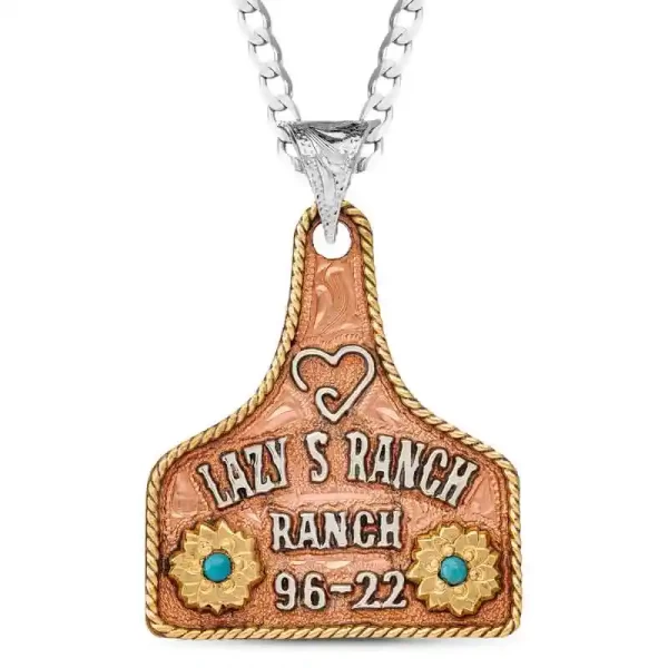 The Meagan Cow Tag Neckace is crafted on a hand engraved, Copper base. Detailed with a Jeweler’s Bronze rope edge, flowers and German Silver lettering. Scroll down to customize the lettering & stones.